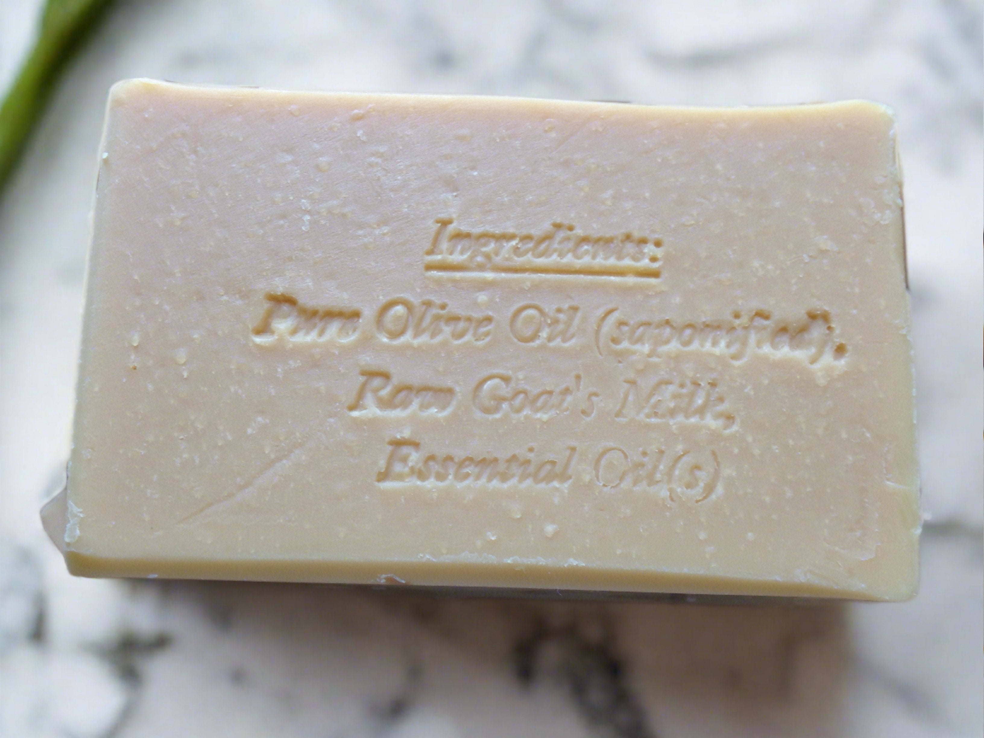 Ingredients: Saponified Extra Virgin Olive Oil, Raw Goat Milk, Pure Essential Oil of Palmarosa and Lavender